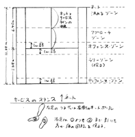 Bサーブのスタンス・・サーブの構えのスタンスでは、(右ききの場合)左足のつま先は右側のポールを向けるのが基本だそうです。左足はこれと平行に置くのが素人で、うまい人は、上の図に示したように、左足のかかとの後ろの方向に置くことが多いそうです。これの方が体の回転をうまく使って打つことができるためだそうです。